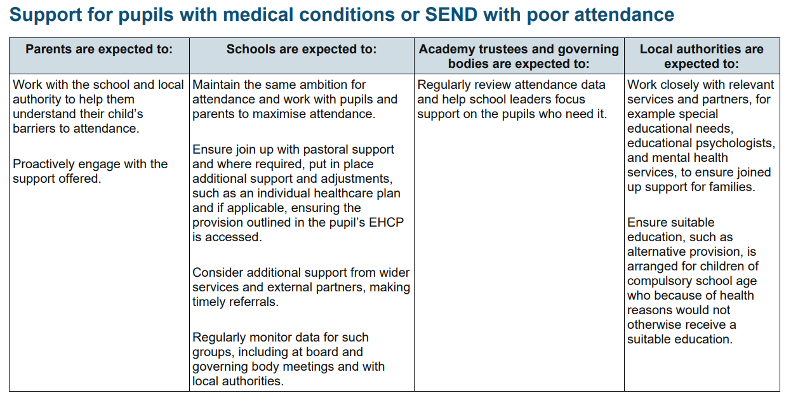In August 2024, the Department for Education published 'Working Together to Improve School Attendance.' The document includes a summary table that outlines the responsibilities for supporting children with medical conditions or Special Educational Needs and Disabilities (SEND) who have poor attendance. The table below details these expectations.